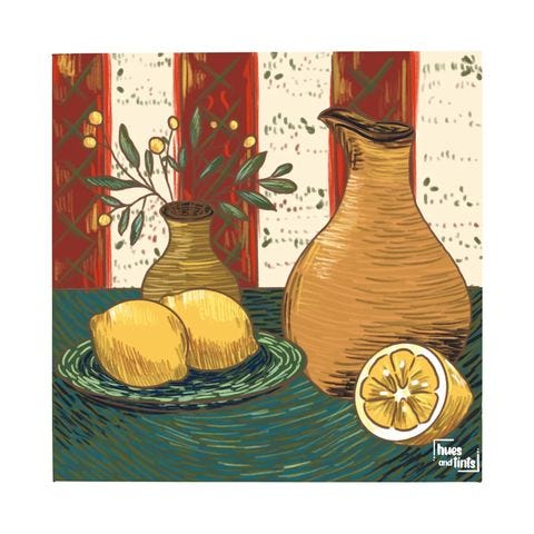 Art: Inspiration photos - Carafe and Dish with citrus Fruit, Vincent van Gogh, Paris, (February-March, 1887). Created by Nupur Lele